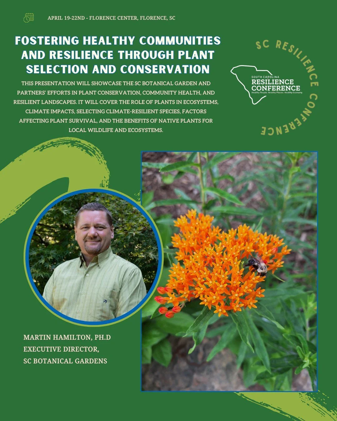Environmental & Ecological Conservation sessions at this yearβs SC Resilience Conference will explore how sustainable practices and conservation strategies protect natural systems and strengthen communities. Keynote speaker Tom Mullikin, Director of the South Carolina Department of Natural Resources, will open the conversation on statewide conservation priorities and sustainable resource management. Amber Kuehn will present on preserving critical habitats on Hilton Head Island, while Susan Lunt and Patricia Whitener will demonstrate sustainable outdoor practices that enhance environmental health across South Carolina. Martin Hamilton will discuss how plant selection and conservation planning contribute to resilient, thriving ecosystems. Together, these sessions will offer practical strategies, inspiring examples, and innovative approaches to advancing sustainability and conserving South Carolinaβs natural resourcesβand there is much more to discover.