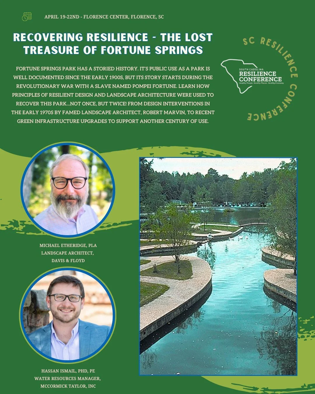 We believe deeply in the message of βHealthy people, healthy placesβ. Thatβs why we are offering morning yoga sessions each day before the conference for attendees to center themselves before heading to the conference center, healthy food and drink options throughout the day, and a βRelaxation Stationβ with aromatherapy and calming design. We also have optional pre-conference tours available for attendees to learn more about Florence and the great resilience work being done here in SC.